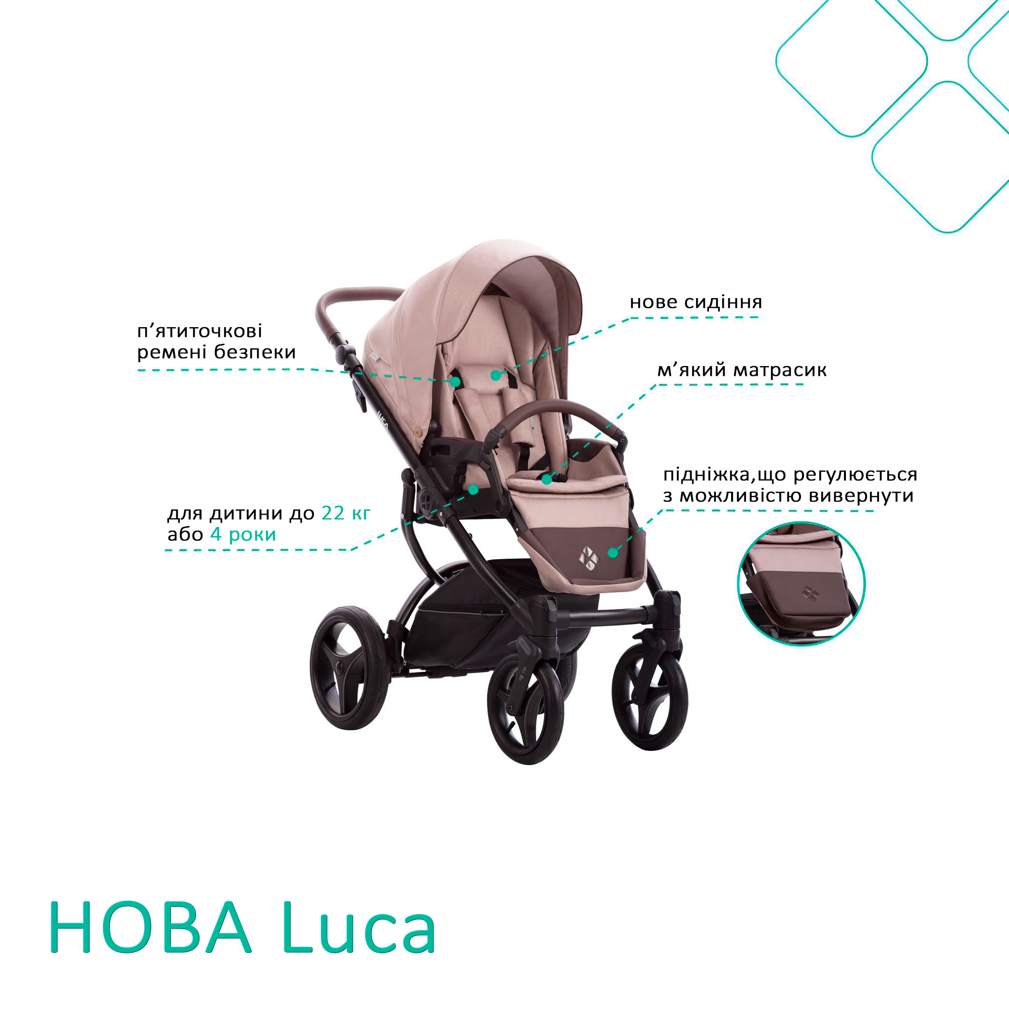 - Матеріал для оббивки коляски виготовляється c технологією UV50 + для захисту від УФ-випромінювання
